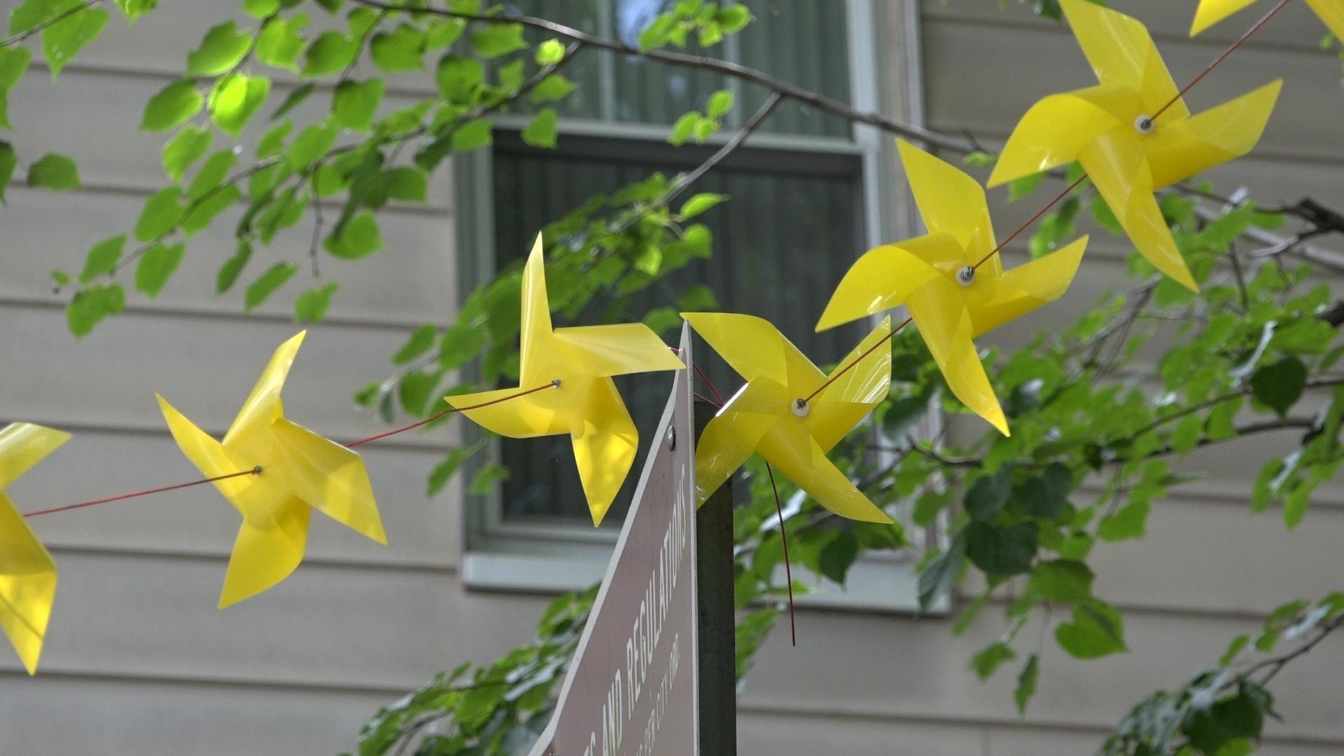 The pinwheels will spin until Wednesday. Each park has a different color, and city officials hope people will take one from each of them.